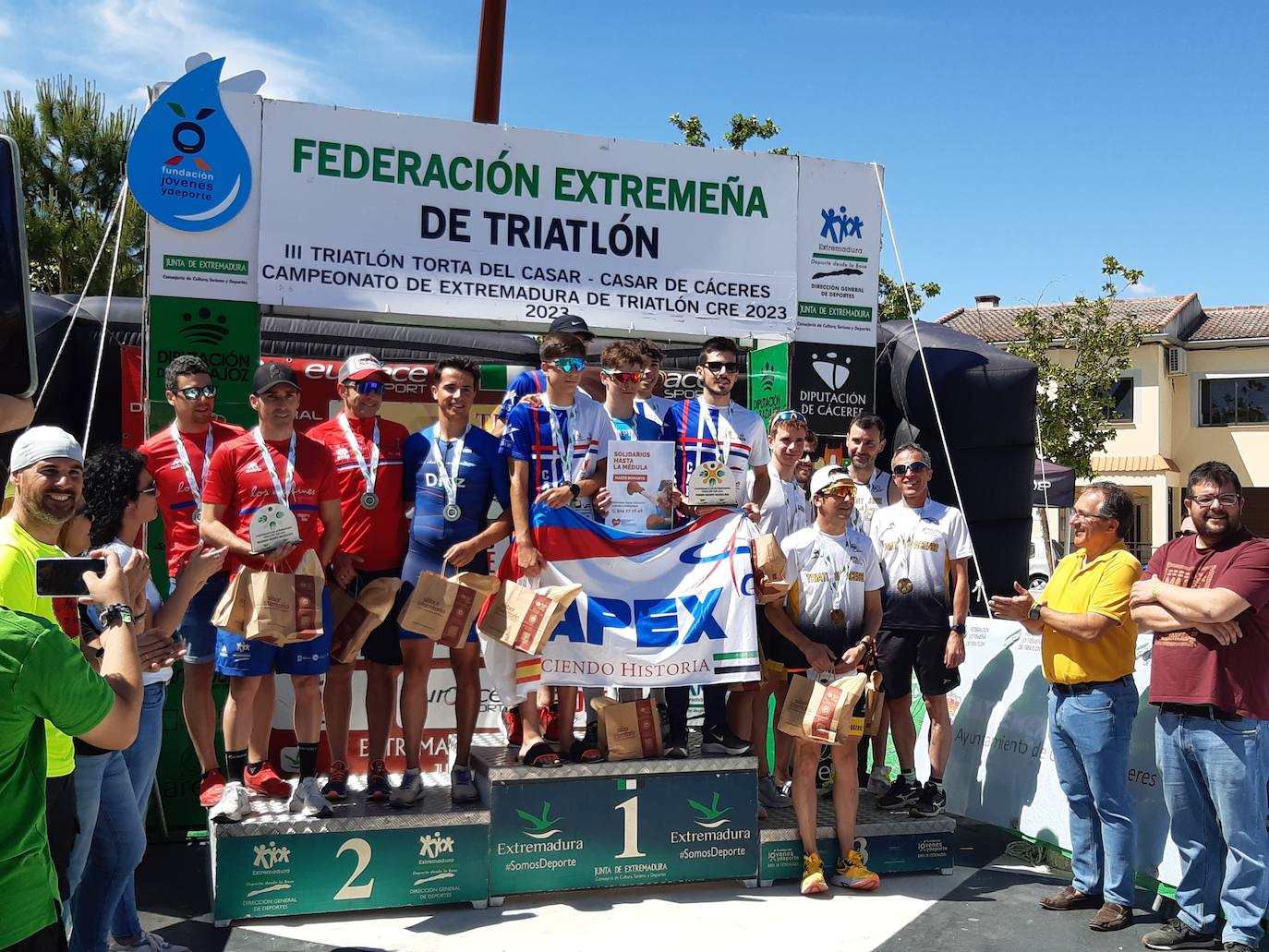 Los equipos ganadores han posado en el pódium con el cartel de la Asociación para la Donación de Médula Ósea de Extremadura, que también ha contado con un stand informativo hoy en Casar de Cáceres.
