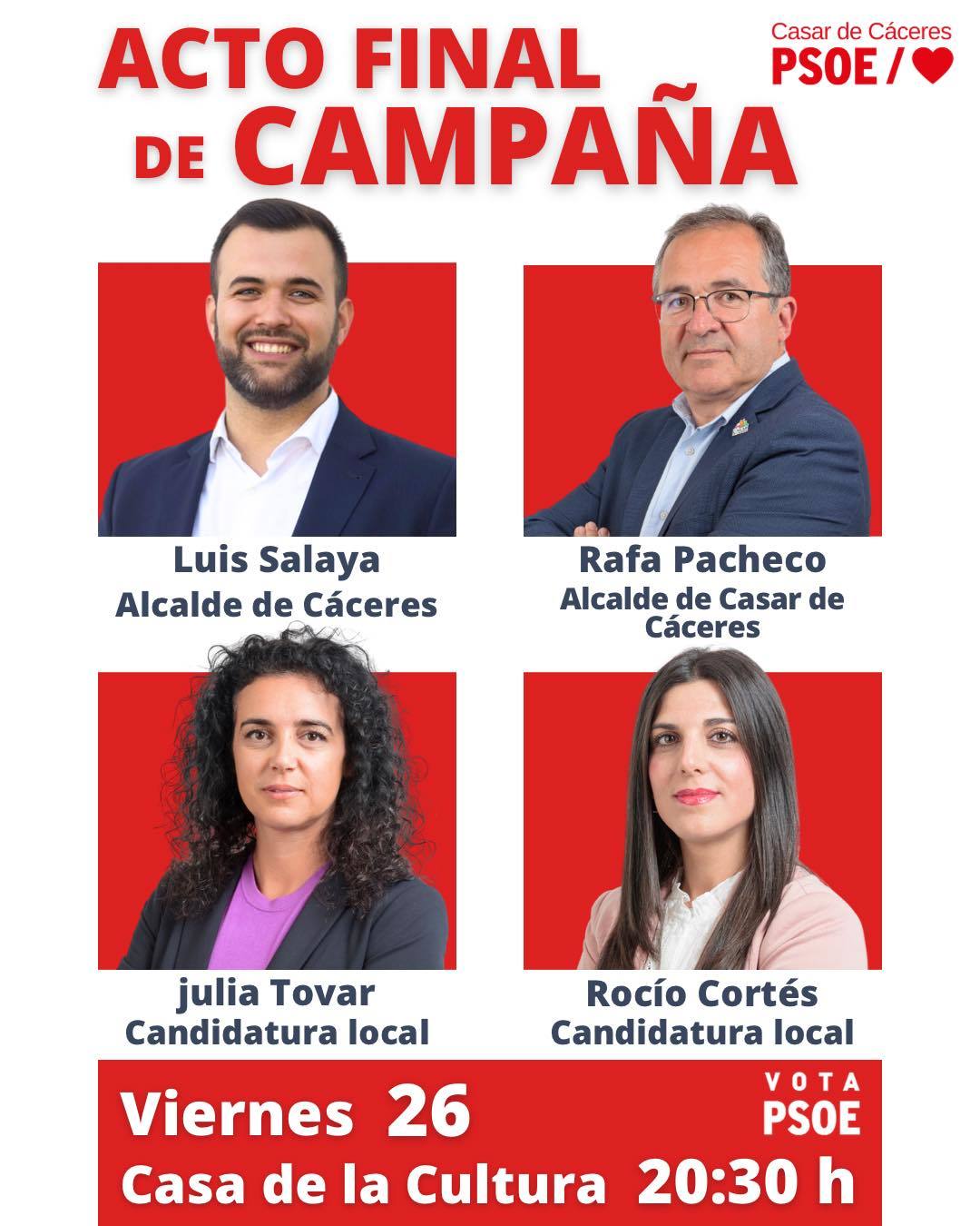 En esta ocasión intervendrán el alcalde y candidato a la alcaldía, Rafael Pacheco, que estará acompañado por el regidor cacereño, Luis Salaya; y las integrantes de la candidatura que ocupan el segundo y tercer puesto, Julia Tovar y Rocío Cortés.