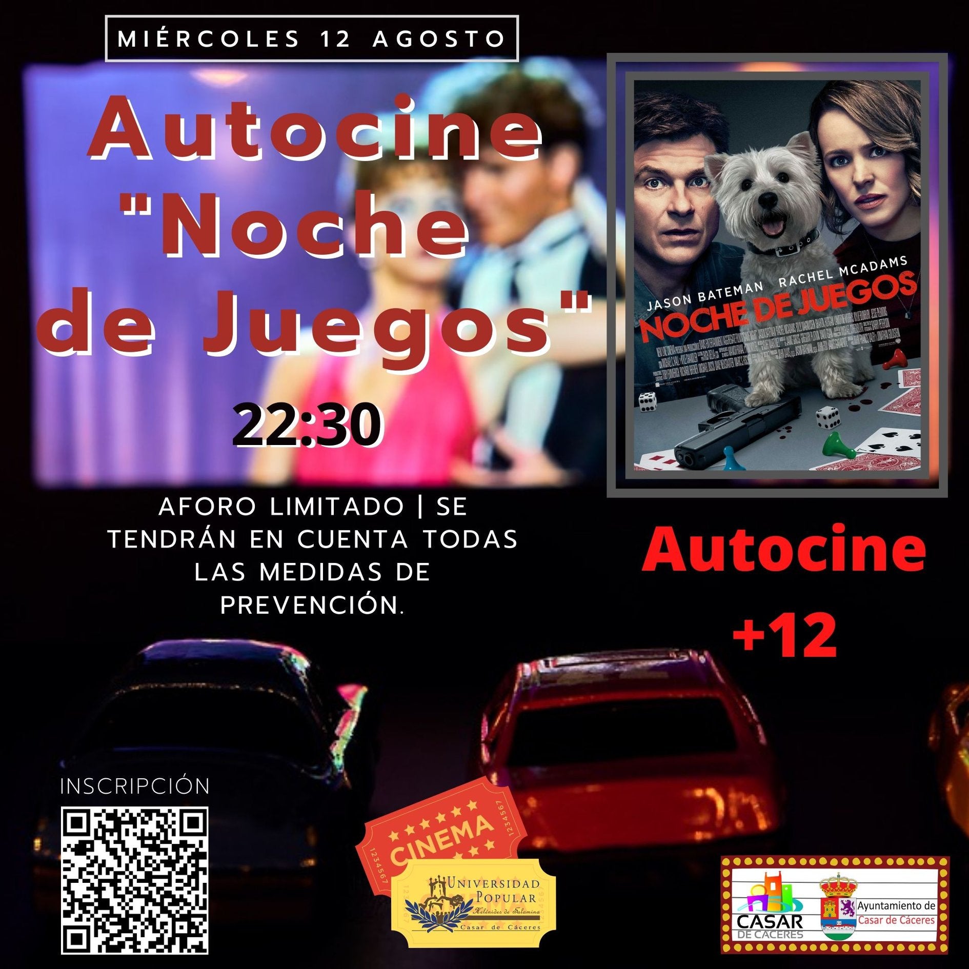 La cuota de reserva por persona será de dos euros. Para el desarrollo de este encuentro se ha publicado a través de redes sociales un protocolo. Se indica que la película 'Noche de juegos' se proyectará a las 22.30 horas, aunque se podrá acudir al lugar a partir de las 21.00 horas. La ubicación de los coches será por orden de llegada. El sonido de la película podrá escucharse por la radio del coche o a través del teléfono móvil.