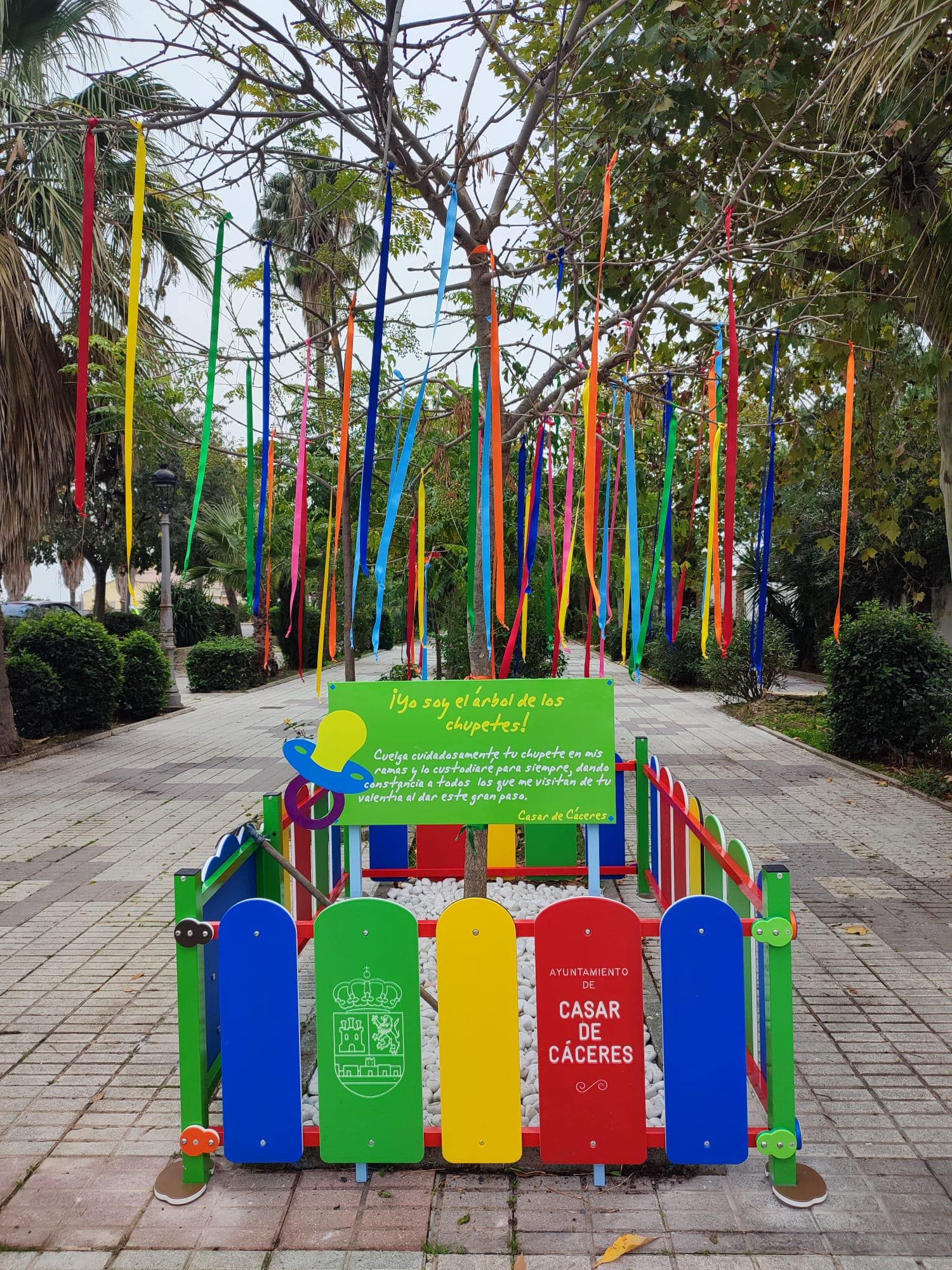 La alcaldesa Marta Jordán ha dado a conocer esta iniciativa a través de redes sociales. «Este año hacemos un homenaje a los más pequeños de los hogares casareños inaugurando el 'Árbol de los chupetes', esperamos que le deis mucho uso y sea un sitio donde nuestros peques dejen una etapa de sus vidas», ha expresado. Numerosas cintas de colores cuelgan de un árbol y en ellas las familias podrán atar los chupetes de sus pequeños. En el cartel se anima a los niños a colgar los chupetes y dar ese gran paso en los primeros años de vida.