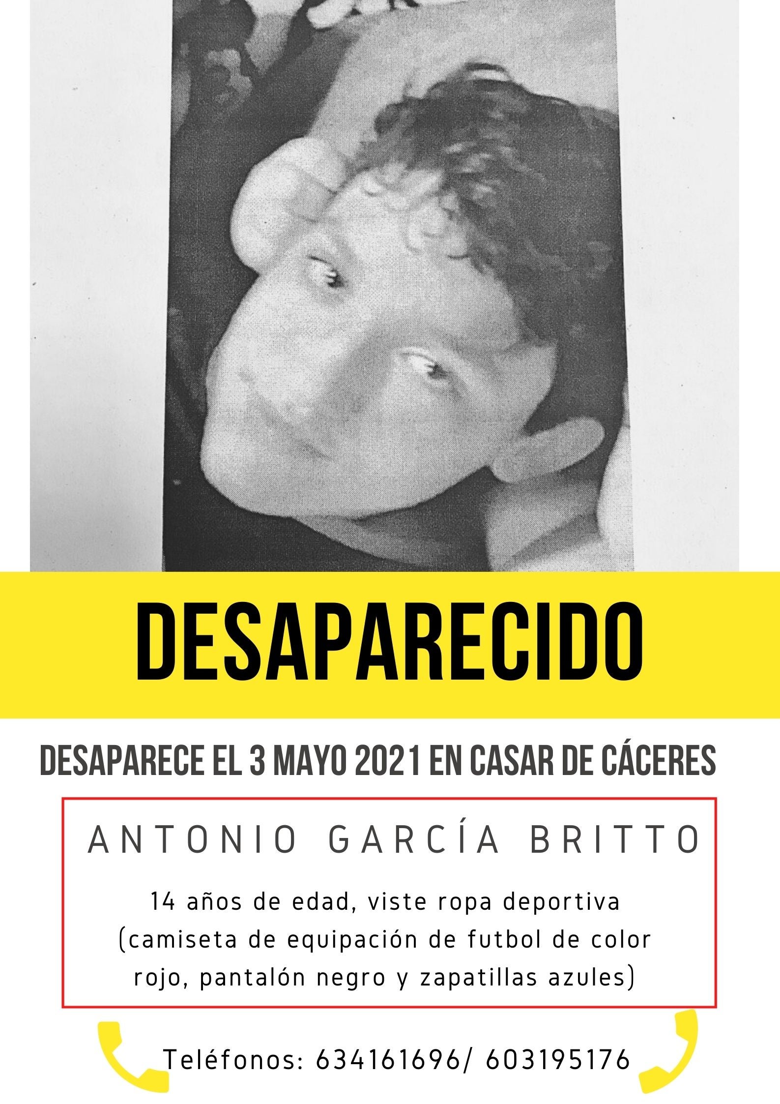 La Guardia Civil ha comenzado la búsqueda esta mañana del menor de 14 años, Antonio García Britto, desaparecido ayer en la localidad. En el momento de la desaparición vestía una camiseta roja, un pantalón negro y zapatillas azules.