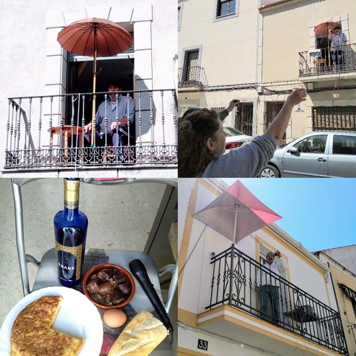 Luego han sacado las morcillas frescas y tortillas a sus balcones. Los vecinos se han protegido con paraguas del sol de la mañana, y algunos han alzado los vasos de vino para brindar en la distancia.