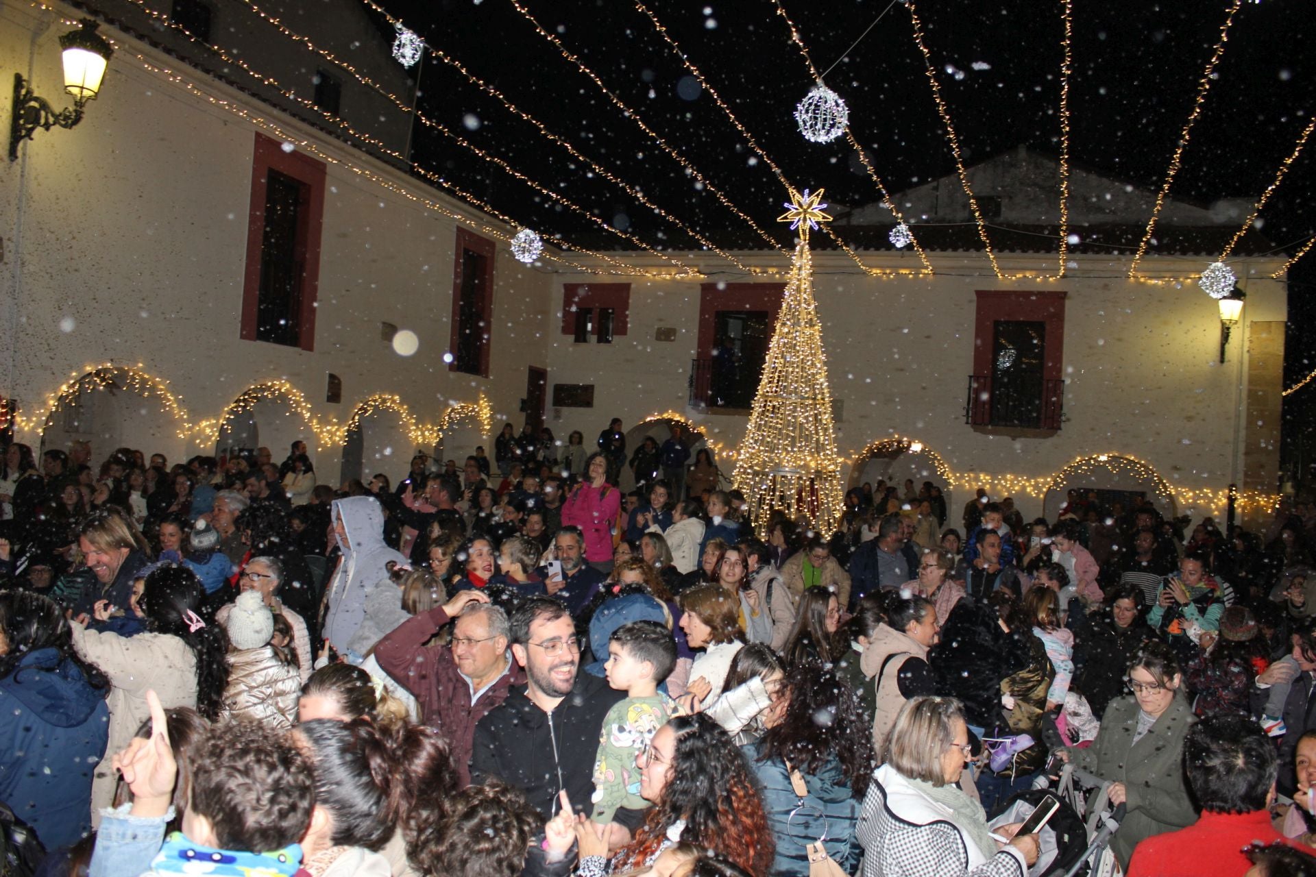 Es la primera vez que Casar de Cáceres ha dado la bienvenida a la Navidad bajo una gran lluvia de copos de nieve. El equipo de gobierno ha querido sorprender a sus paisanos con este ambiente navideño, que han podido disfrutar pocos segundos después del encendido de luces en la Plaza de España.