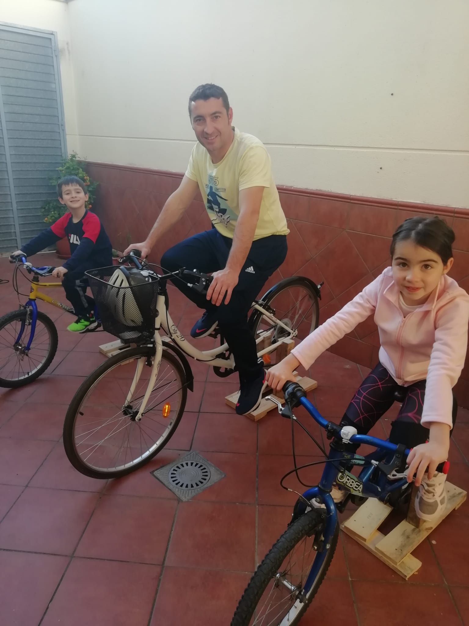 Estos días las bicicletas no salen a la calle, pero algunos vecinos se inventan artilugios caseros para seguir practicando su deporte favorito. Así lo hacen Raúl Dómine y Laura Gómez junto a sus hijos. Ellos han improvisado unos soportes para sustituir los largos paseos que antes daban en familia, y que no podrán volver a hacer hasta que todo esto acabe.