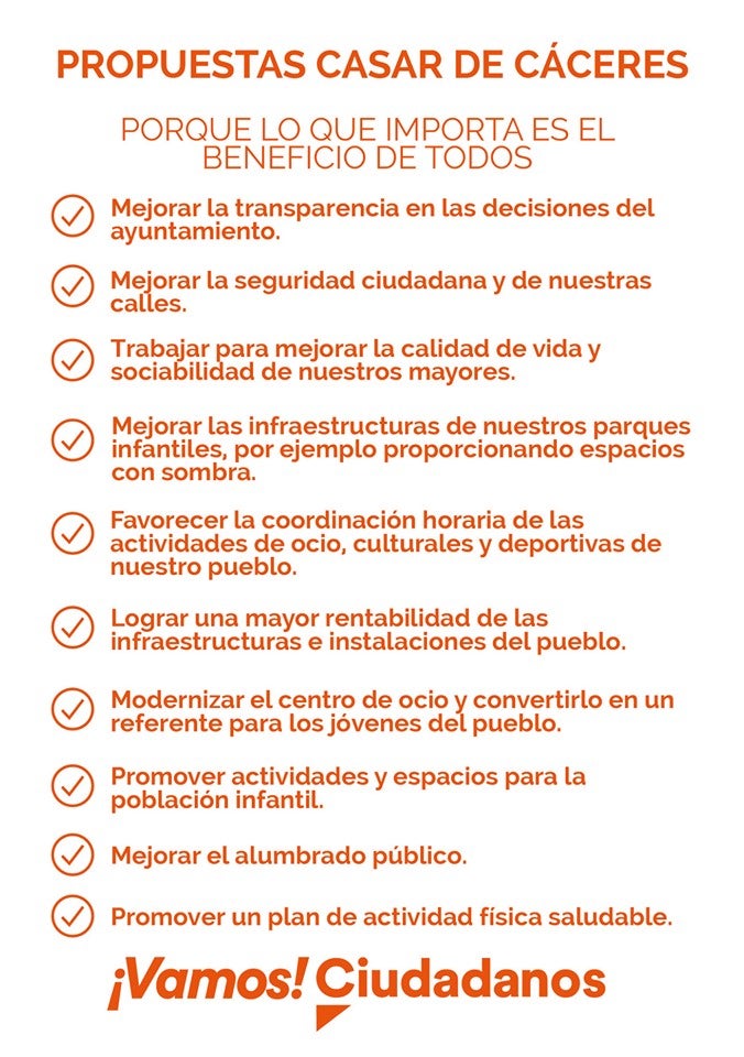 Bajo el lema 'Porque lo que nos importa es el beneficio de todos', Ciudadanos de Casar de Cáceres ha presentado un total de diez propuestas ... para pedir el voto en los comicios del 26 de mayo.