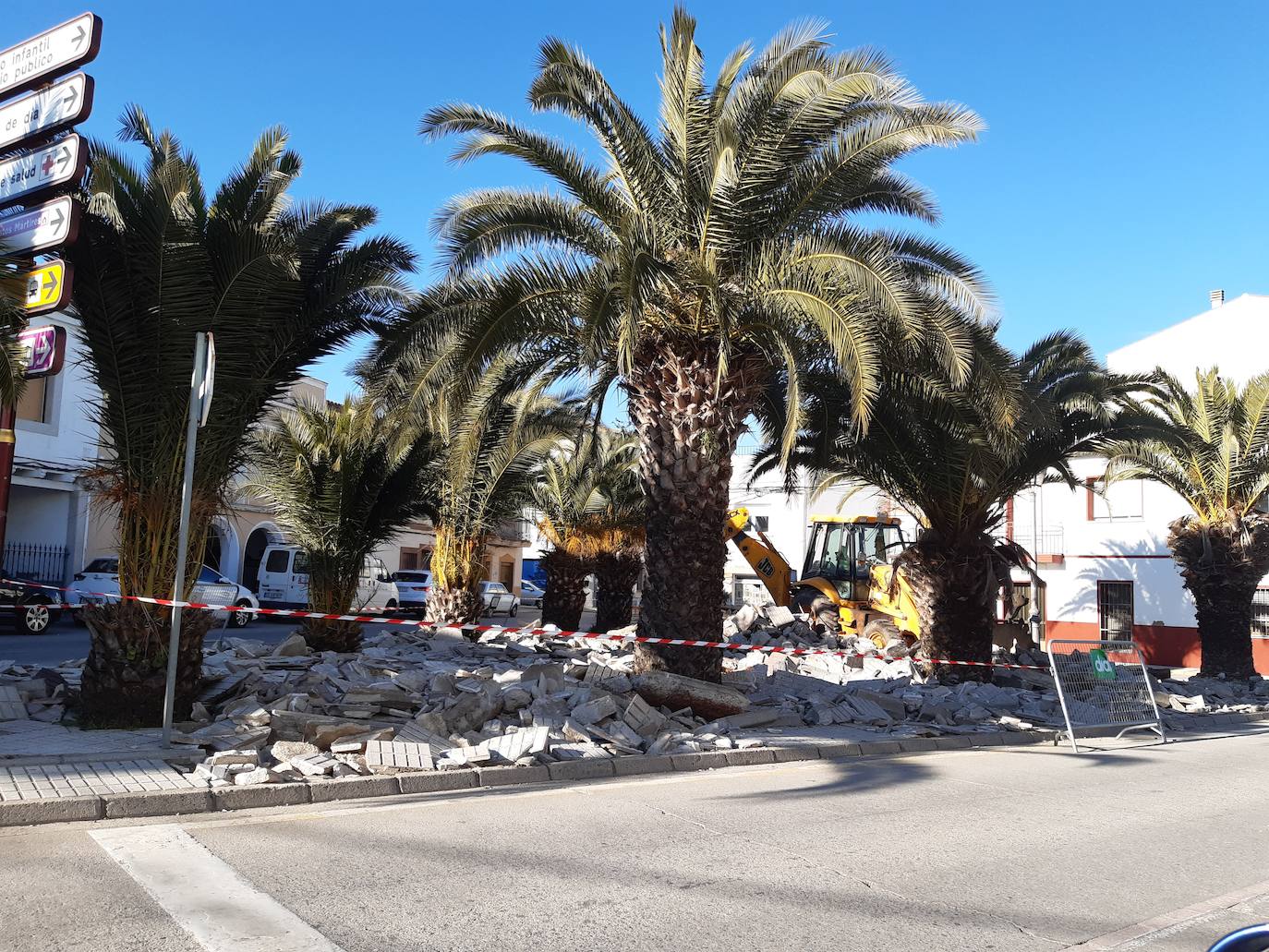 Las obras de la futura Plaza de los abuelos han comenzado con la retirada del pavimento de terrazo. Las diez palmeras continuarán en el mismo lugar, y formarán parte del nuevo escenario que el Ayuntamiento ha diseñado para esta zona.