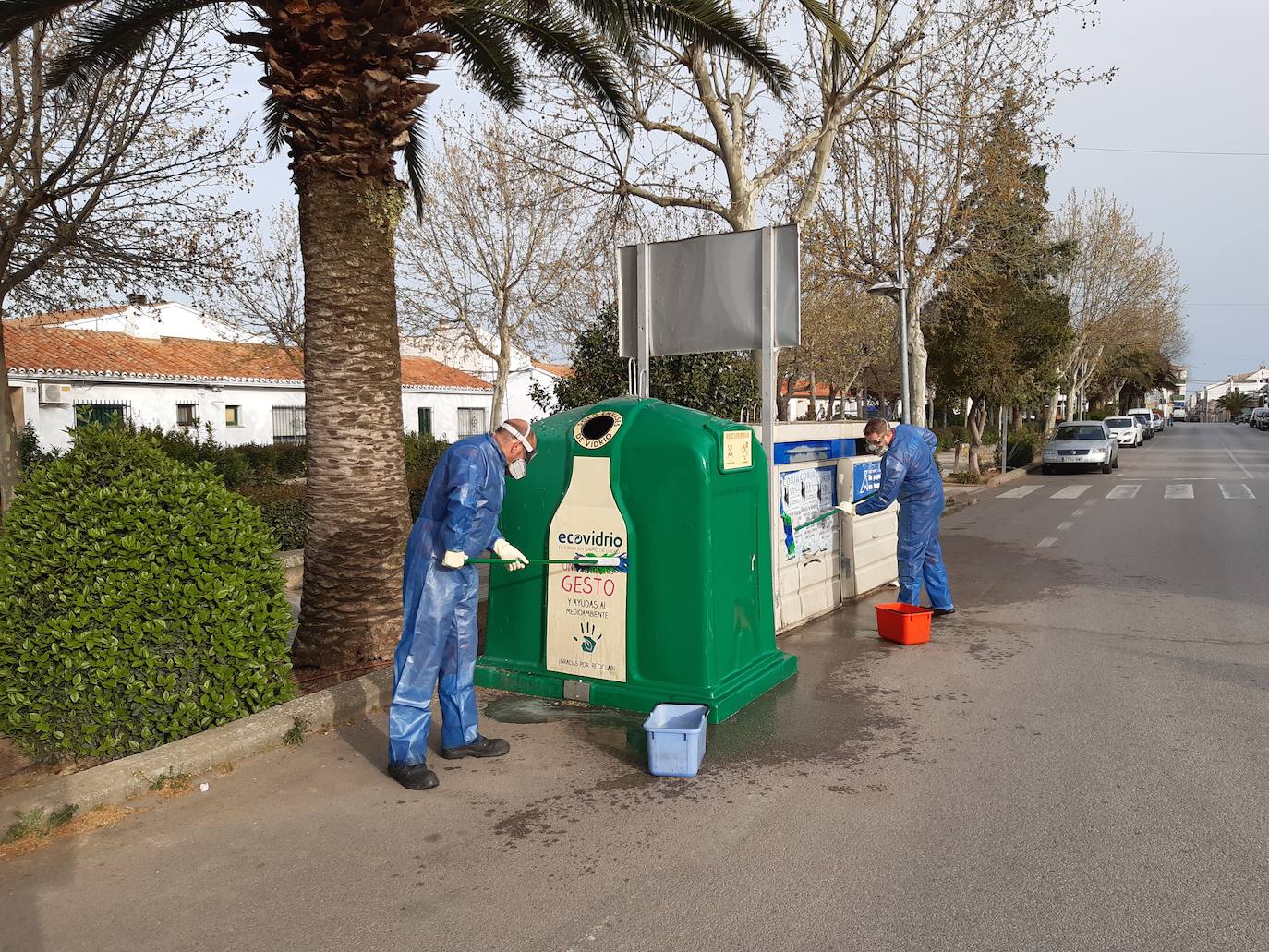 A ... primera hora de la mañana dos empleados del servicio de limpieza, ataviados con equipos de protección (monos, guantes, mascarillas y gafas) han iniciado las labores por el Paseo de Extremadura y los parques. Se limpian contenedores, papeleras y bancos. Para ello utilizan agua con desinfectante, y se ayudan con cepillos.