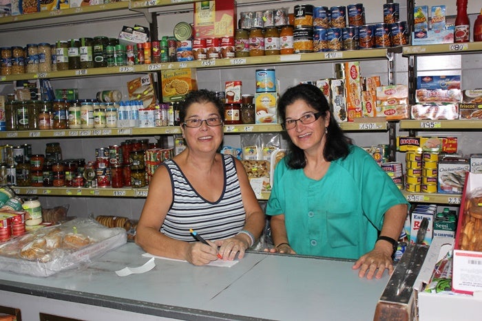 Estudiamos Magisterio, pero no hicimos oposiciones y no tuvimos una plaza nunca. Dábamos clases particulares en el pueblo cuando terminamos la carrera, y después nos quedamos en la tienda. Nuestro padre se jubiló a los 65 años y justo después enfermó, y nos quedamos las dos con el negocio que desde hace ocho años está puesto a nuestro nombre. Desde niñas hemos estudiado y trabajado al mismo tiempo. Después de una noche de fiesta del Ramo nuestro padre nos mandaba a repartir a las casas. Cuando éramos niñas y nos tocaba descargar los cajones del burro para que descansara, había veces que nos quedábamos dormidas dentro de esos cajones. Y si teníamos exámenes íbamos haciendo los repartos con el carro y llevábamos los apuntes para ir repasando.