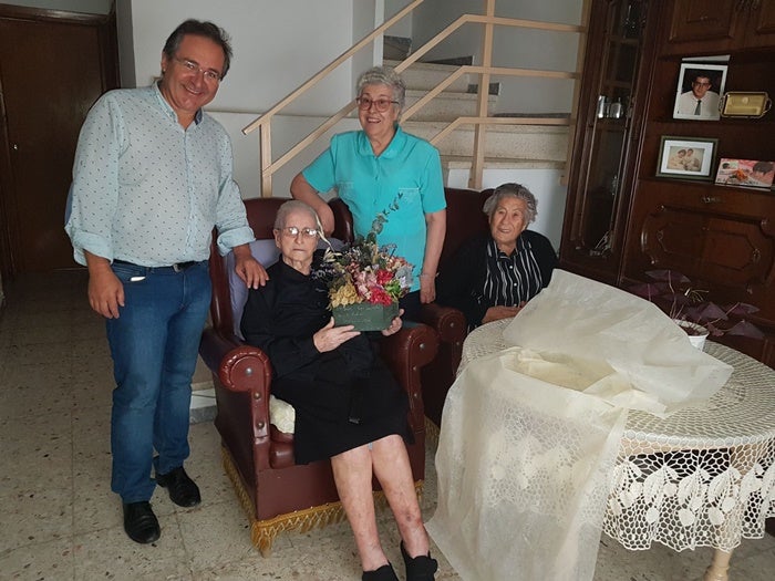 Ella, que ya había adquirido el título de centenaria el pasado 24 de enero, fue homenajeada por el alcalde Rafael Pacheco, quien le hizo entrega de un ramo de flores en su casa. El Consistorio quiso hacerle este reconocimiento el mismo día que cumplió su siglo de vida, pero María vive a caballo entre Barcelona y Casar de Cáceres. En su pueblo pasa el verano y, este año, parte del otoño. Reside en el número 16 de la calle Las Malvinas con su hija Teresa, quien la cuida desde que su padre, Eugenio Cabezón, falleciera en el año 2005. María sintió mucho la pérdida del que había sido su compañero de vida, con quien vivió nada más casarse en la calle Larga, en donde regentaba una barbería. Luego el matrimonio se trasladó a Cáceres. Mi padre enfermó y estuvieron 10 años en Cáceres como portero, relata su hija.