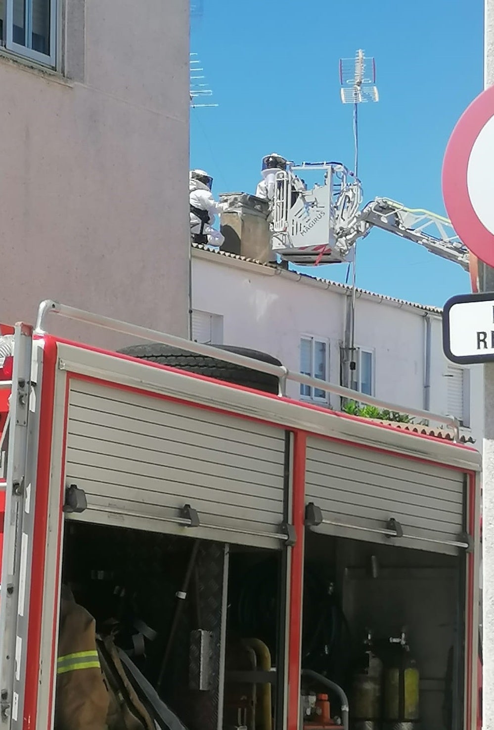 Intervención de los bomberos para eliminar un enjambre de abejas en la chimenea de una vivienda de la barriada Las Malvinas