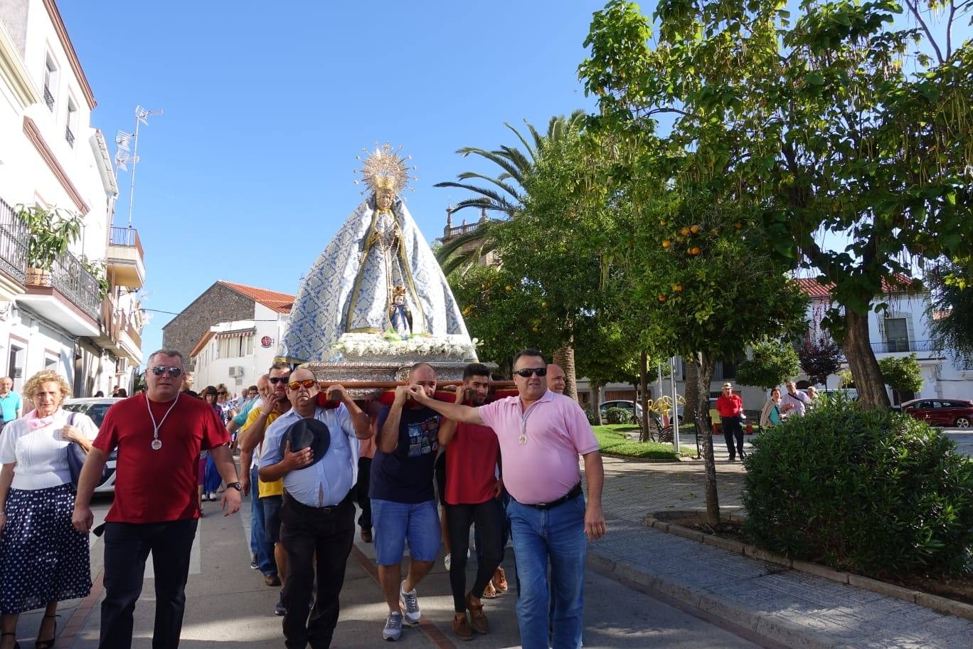 La patrona de los casareños regresó ayer a su santuario, tras haber pasado diez días en la parroquia de la Asunción, donde se celebró su novenario. Salió arropada por decenas de devotos desde la iglesia hasta la Plaza de Toros. Allí fue subida a un camión para su traslado a La Jara.