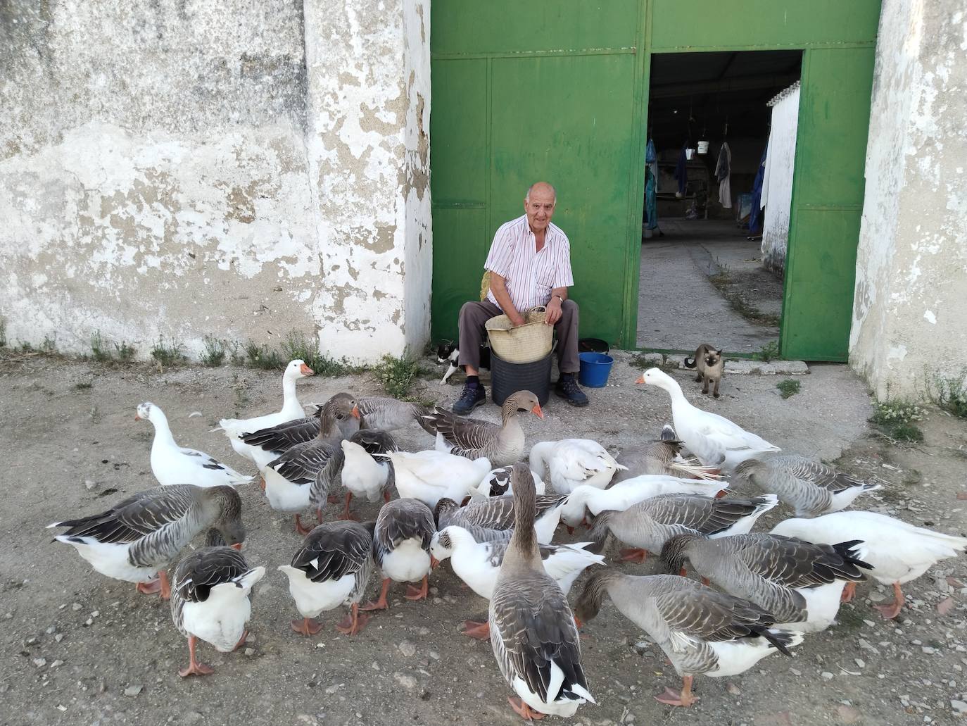 El título de abuelo se lo tiene bien ganado Juan Contreras, no sólo por las nietas que la vida le ha regalado, sino por la dedicación que le presta a diario a un grupo de 25 ocas y gansos que habitan en La Charca de Casar de Cáceres. A día de hoy se ha convertido en la persona más fiel de todas esas aves, que cuida como si fueran suyas, y por las que siente un gran apego y cariño.