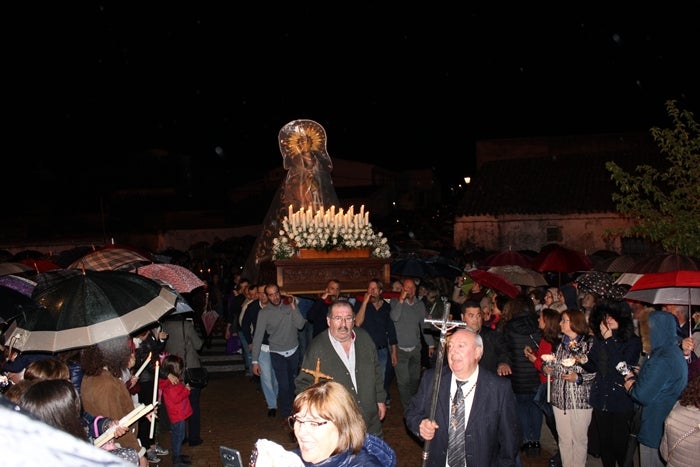 La lluvia respetó por la tarde, pero por la noche comenzó a llover a la hora de la salida de la Virgen. Cuando aflojó, La Soledad apareció por la puerta lateral de la iglesia, protegida por un plástico que años atrás se confeccionó acorde a su figura y manto para momentos como el de ayer por la noche.