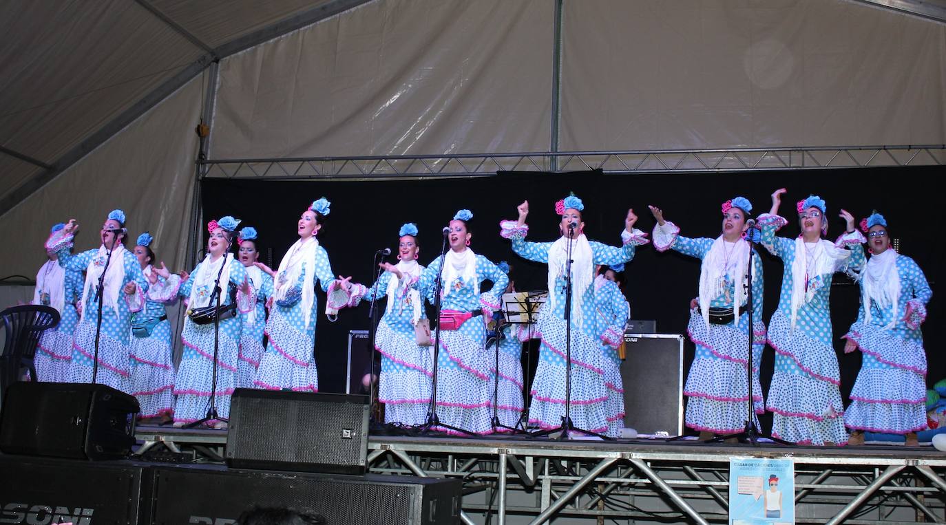 En total 17 mujeres se subieron al escenario de la caseta instalada en la plaza de Sancho IV, perfectamente ataviadas como rocieras. Y allí ante una carpa repleta de público, en su mayoría haciendo uso de la mascarilla, cantaron varias letras que habían preparado para los casareños, haciendo alusión a personas y proyectos de la localidad.