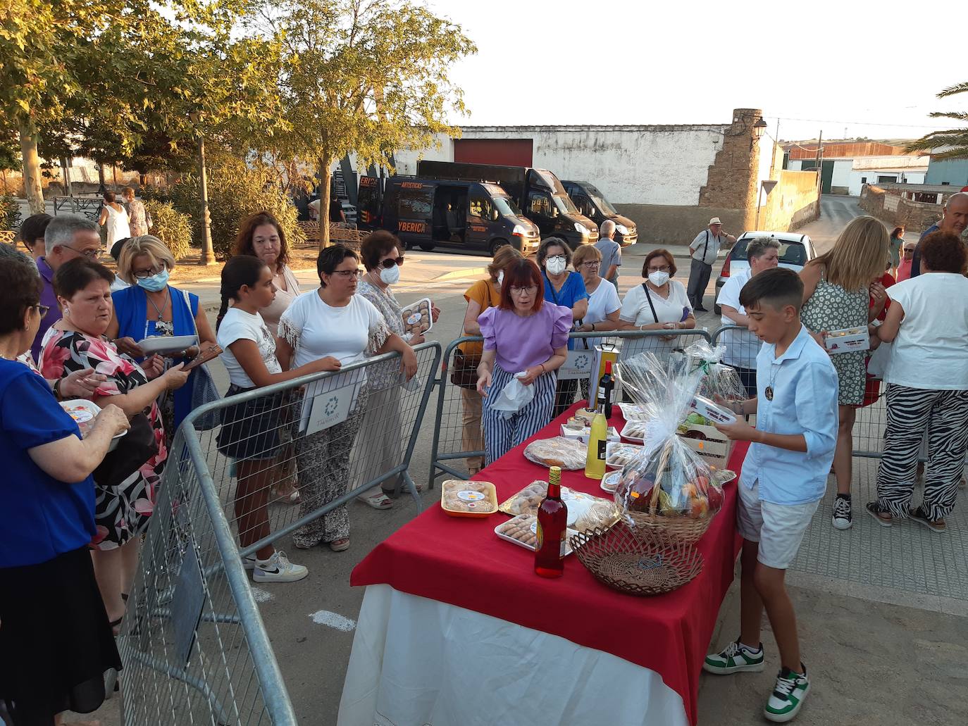 La tradicional Mesa de ofrendas con motivo de los festejos a Santiago se celebró ayer tras la novena, a las puertas de la ermita, y con menor afluencia de público que los años previos a la pandemia.