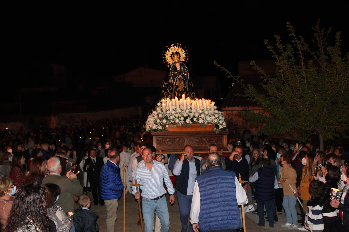 En la explanada de la Ronda de la Soledad se concentraron centenares de personas para ver cómo la Virgen entraba a su ermita. Fue una noche cálida, iluminada por las velas, y en la que los sentimientos volvieron a aflorar. Durante el recorrido por las calles del pueblo, La Soledad paró para escuchar las saetas de quienes se las regalaron.