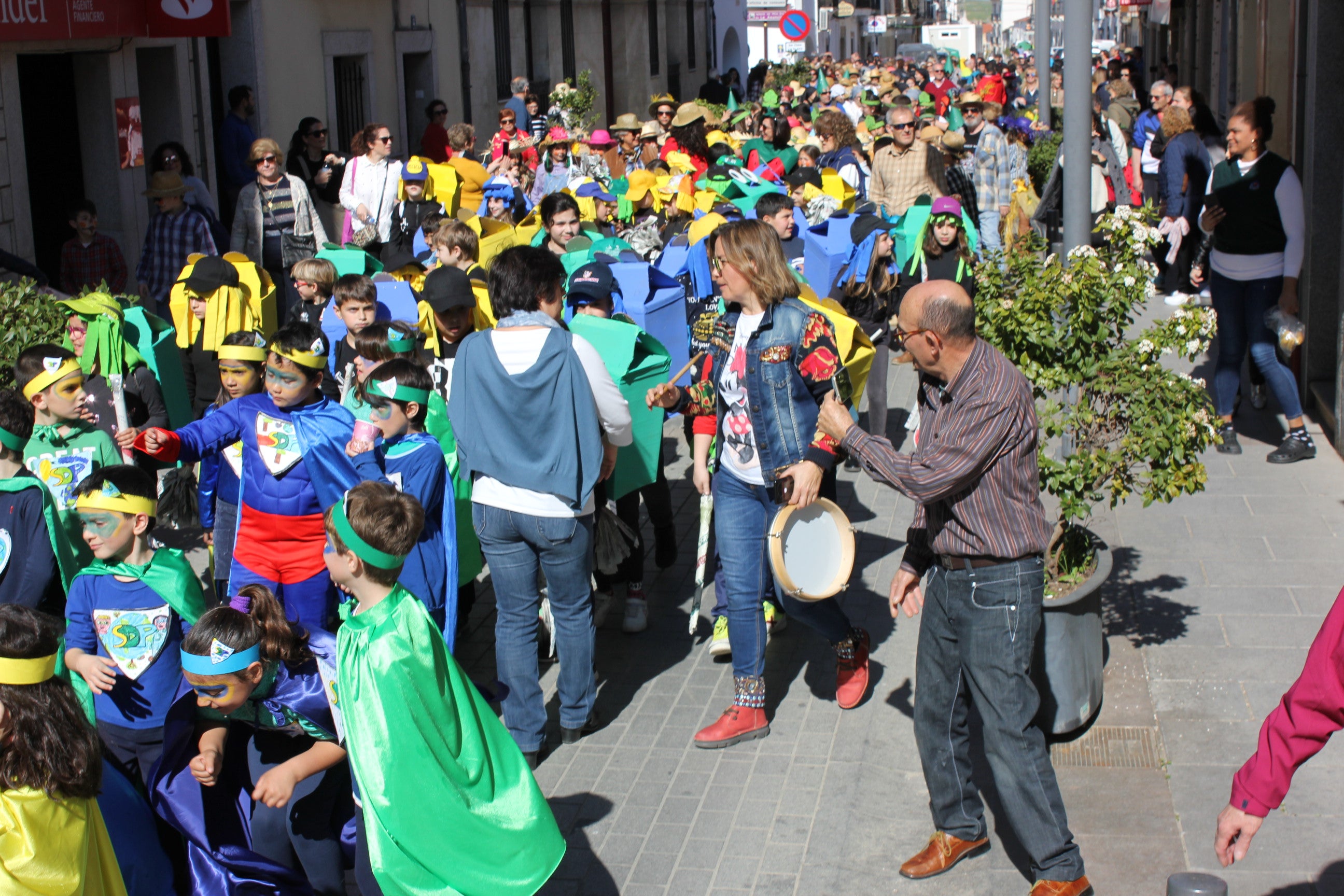 Tras ellos han caminado los centenares de escolares de Infantil y Primaria, que este año han disfrutado ataviados con trajes haciendo referencia a la naturaleza y al cuidado y respeto del Medio ambiente. Se han podido ver árboles y flores, frutas, animales en peligro de extinción, papeleras y granjeros, soles y nubes, entre otros. Una gran variedad de diseños, elaborados con la ayuda de las familias semanas atrás, y para los que se han escogido materiales reciclables. Han dicho que no al plástico a modo de concienciación de sus alumnos.