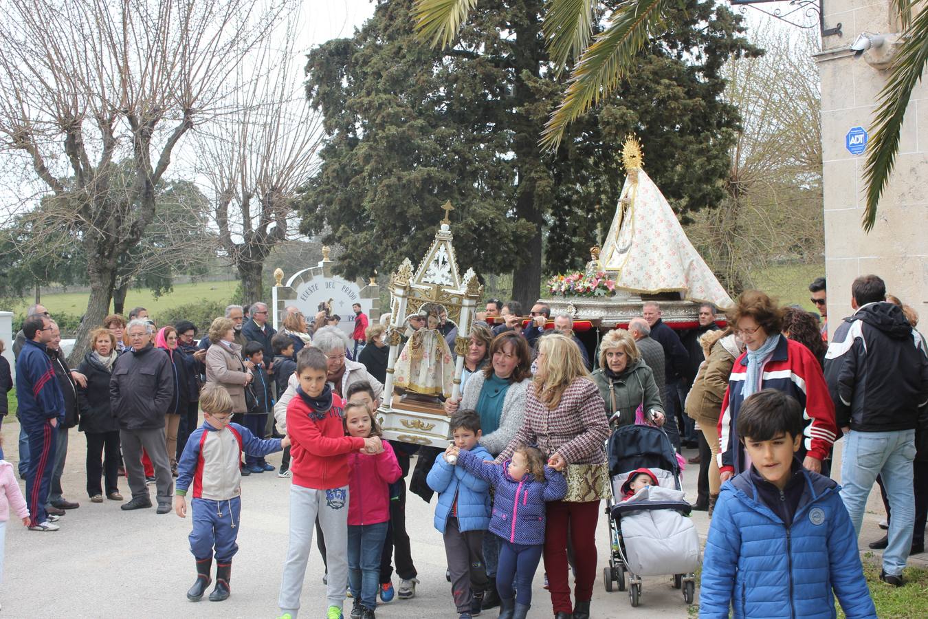 Poco antes de las dos de la tarde, los devotos salieron del santuario porque, esta vez, la Virgen sí iba a salir en procesión. Hacía ya dos años que no lo hacía por la lluvia, pero la jornada, pese que estaba nublado y algo desapacible, dejó salir a la patrona. La Virgen lucía el manto de colores. La cofradía lo denomina el manto de la primavera. Llevaba el rostrillo, su corona, y estaba adornada por diferentes tipos de flores.