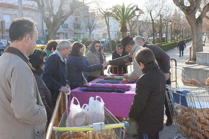 Desde bien temprano se empezaron a vender las roscas. A un euro. Tanto en los soportales de la plaza como en el Paseo de Extremadura junto a la estatua Helénides de Salamina. Centenares de cordones de todos los colores llenaban las mesas de los puestos de venta. Nadie quería quedarse sin ellos, porque dicen que previene contra el mal de garganta. También se vendieron los pirulís elaborados como cada año por una familia devota, que los dona para este día.