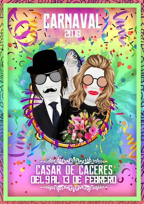 Empecé con un boceto a añadirle serpentinas de colores y máscaras y objetos de decoración, primero decidí incorporar una careta típica del carnaval, pero luego pensé en hacer dos bujacos que es lo más típico del pueblo, ha manifestado el premiado a HOY CASAR. Casi todos los elementos que aparecen en el cartel han sido creados por este joven con herramientas digitales.