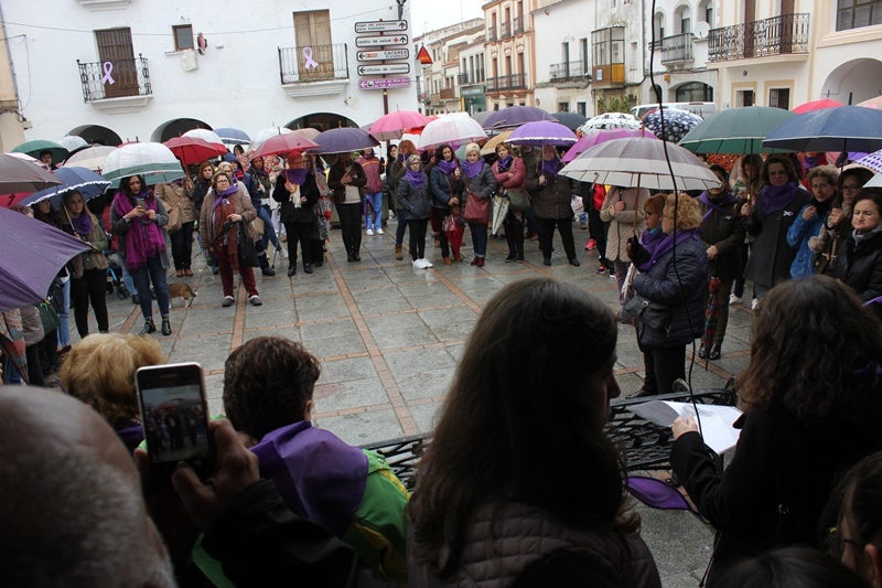 En este acto el Ayuntamiento ha repartido 150 pañuelos violetas. Las alumnas del IESO Vía de la Plata han alzado sus brazos con pequeños carteles en el que todas lanzaban el mismo mensaje: Si nosotras paramos, se para el mundo.