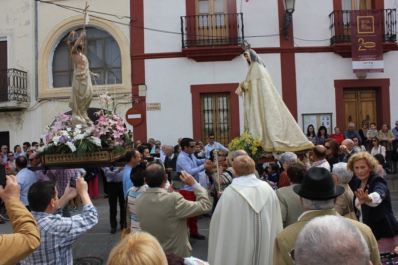 Posteriormente se llevará a cabo la tradicional procesión con las imágenes de Cristo Resucitado y la Virgen popularmente conocida como de la Alegría. Realizarán recorridos distintos. Los varones acompañarán al Cristo y las mujeres a la Virgen. El encuentro tendrá lugar en la Plaza de España. Allí se procederá a quitar la vestimenta de color negro a la Virgen, y se le dejará con el manto de color beig para caminar junto a Cristo resucitado en su regreso a la parroquia.