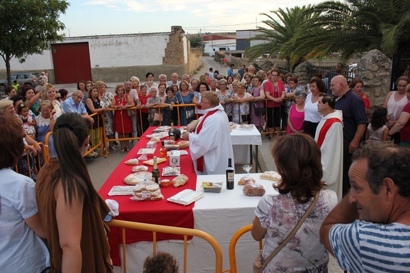 El pasado sábado, tras finalizar la novena, el párroco Luis Vidal Arias, acompañado del padre Resti, salieron a la puerta del santuario para bendecir las decenas de productos que se iban a poner a la venta. Algunos de ellos fueron adquiridos por la Hermandad y otros donados por vecinos casareños. Primaban los dulces típicos, aunque también había alguna botella y sandías.