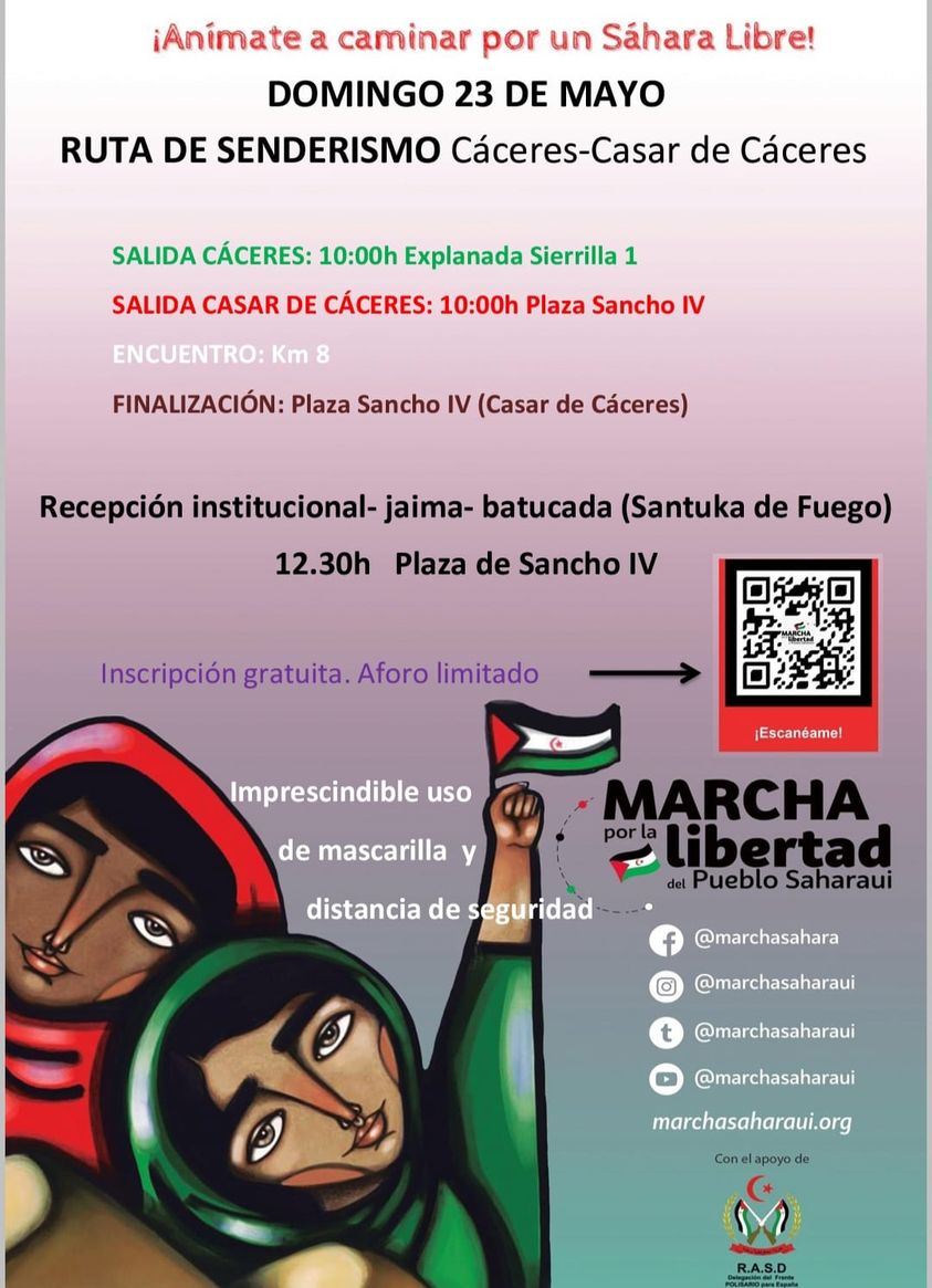 La Asociación de amigos del Pueblo Saharaui ha organizado una marcha senderista para exigir la libertad del pueblo saharaui. Partirá a la misma hora desde dos puntos, uno de ellos, en la explanada de la Sierrilla en Cáceres. El otro punto de encuentro será la plaza de Sancho IV de Casar de Cáceres. Mientras los participantes de Cáceres caminan en dirección a la localidad casareña, los de Casar lo hacen a la inversa. Se encontrarán en el kilómetro 8 de la CC-38.