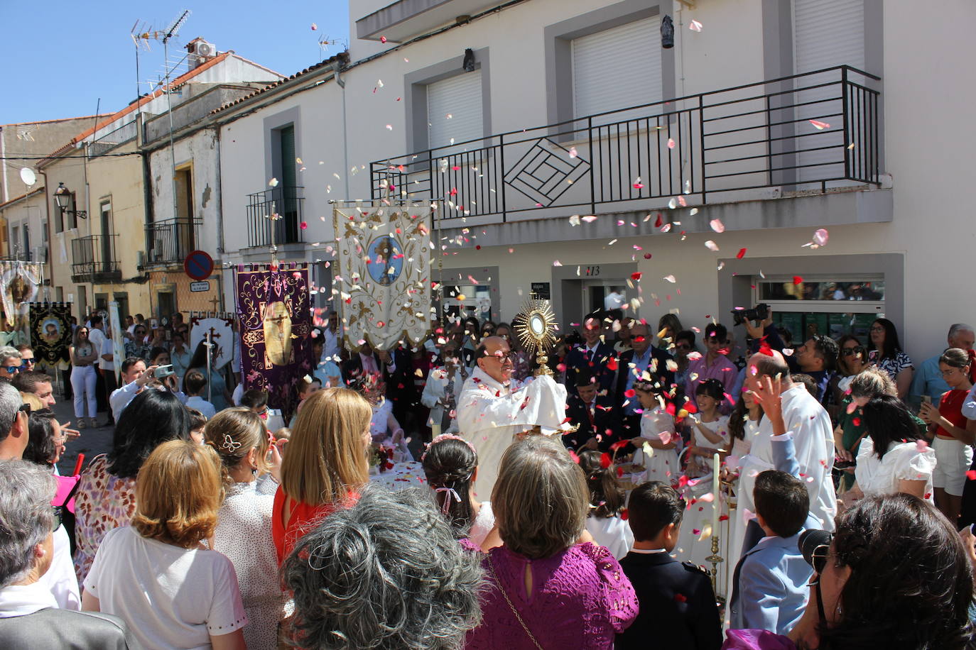 Hoy, por fortuna, corría la brisa y los niños que han tomado este año la Primera Comunión, ataviados con sus trajes, han sobrellevado el largo desfile por las calles Iglesia, El Santo, Ronda del Egido, Larga Alta y Baja, Santiago y Constitución. Ellos han vuelto a ser los protagonistas de esta cita solemne, en la que han acompañado en cada uno de los altares al Santísimo y, tras su Adoración, han lanzado miles de pétalos que han embellecido esos instantes.