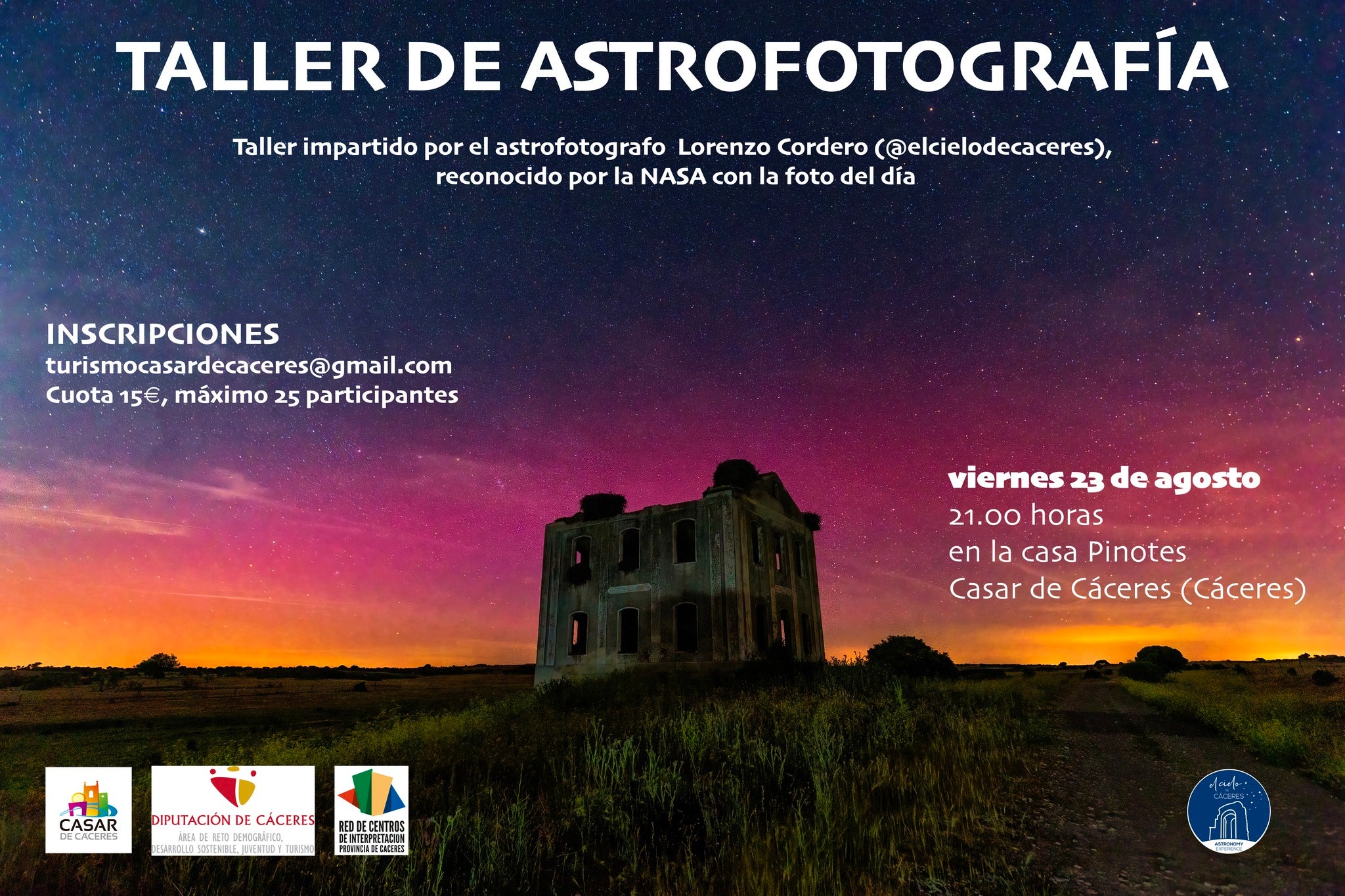 Ambas actividades tienen abierto el plazo de inscripción y el número máximo de participantes se establece en 25. La cuota del taller de astrofotografía tiene una cuota de 15 euros, mientras que la del corte de paleta es de 12 euros. Ambas se llevarán a cabo en la Casa Pinotes.