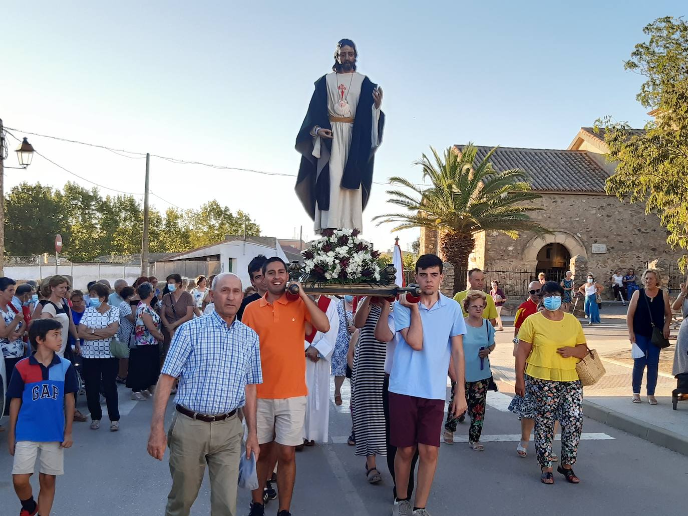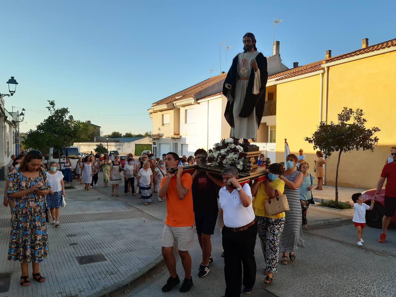 El acto contó con poco público, pero no faltaron varias decenas de fieles que quisieron acompañar al santo tras dos años de ausencia por las calles Santiago, Avenida Constitución y Larga Baja. El calor de la tarde no impidió acercarse a él y demostrarle devoción.