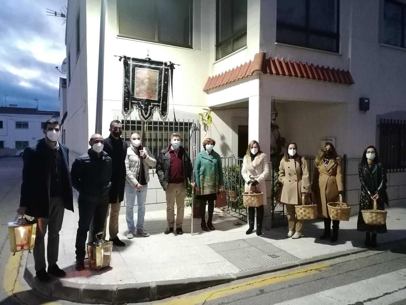 Los representantes de la cofradía del 2020 han acudido con la vara, el estandarte, los faroles, campanas y cestas a las seis de la tarde al punto de encuentro. Tras realizar varios rezos y cantar algunas coplas de Ánimas, el mayordomo saliente, Luis González, ha hecho entrega de su vara de mando a la nueva mayordoma.