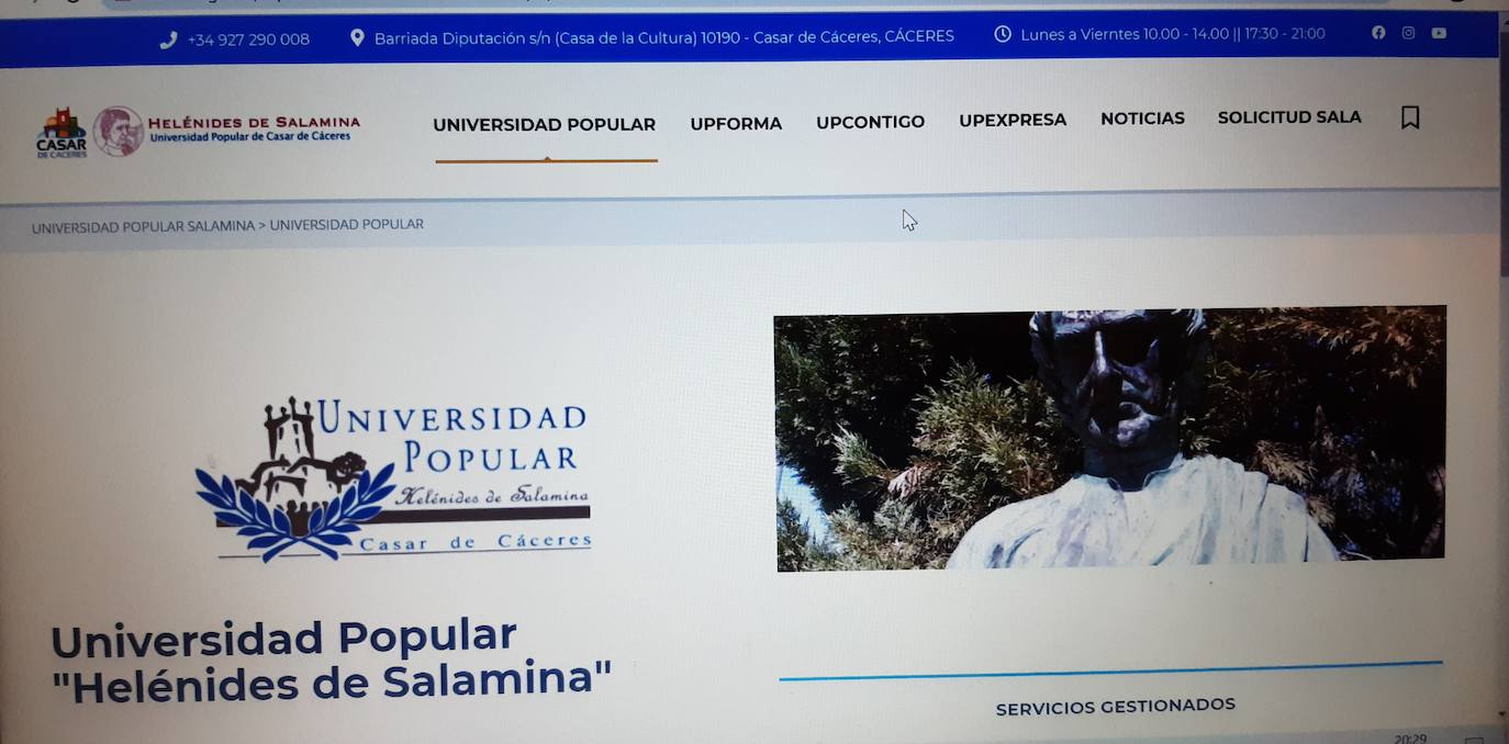A través de la página www.upcasardecaceres.es los casareños podrán navegar de una forma sencilla por la Universidad Popular Helénides de Salamina. Se ofrece así una herramienta útil para cualquier usuario que quiera conocer los cursos y talleres que se ofrecen, inscribirse en ellos de forma online, o ver desde casa un acto al que no ha tenido posibilidad de asistir presencialmente.